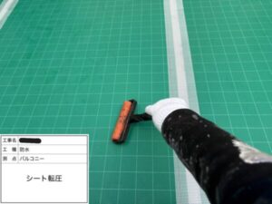 転圧ローラーという道具でシートに出っ張り・波打ちなどないよう整えます。